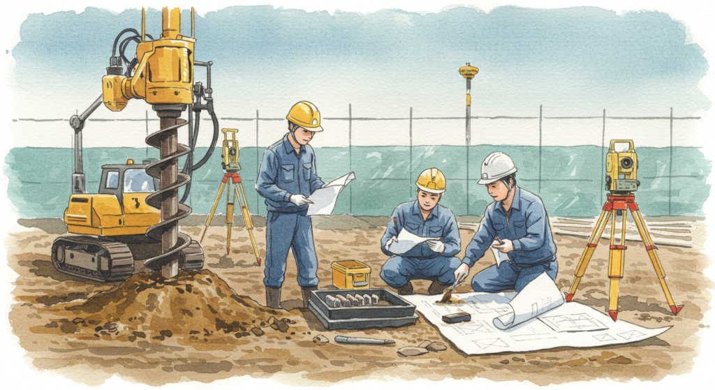 地盤改良工事の実施段階では、改良工法の選定が最も重要な決定事項となります。土質条件の確認により、表層改良、柱状改良、鋼管杭のいずれの工法が最適かを判断します。建物重量の検討では、木造、鉄骨造、鉄筋コンクリート造などの構造形式により必要な地盤支持力が異なるため、建物設計と連携した検討が必要です。費用対効果の比較では、初期費用だけでなく長期的な安全性と保証内容も含めて総合的に判断します。